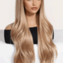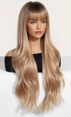 วิกผมสังเคราะห์ยาว 28 นิ้ว สีทองผสมลอนคลื่น มีหน้าม้า สำหรับผู้หญิง